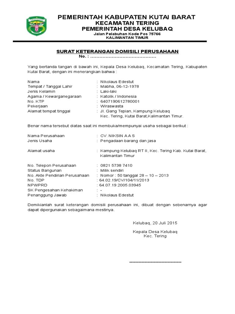 11 contoh surat keterangan kerja penghasilan domisili usaha yang baik dan. Doc contoh surat perjanjian kerja kontrak kerja karyawan . 503/ /v.58.iv.135/iii/2012 · benar saat ini membuka/mempunyai usaha sebagai berikut : . Nantinya, surat keterangan domisili akan digunakan untuk pribadi dan untuk perusahaan. Benar pada saat ini membuka / mempunyai usaha sebagaimana tersebut di bawah ini : Nah, bagi kami, dua jenis type dokumen ini sudah biasa digunakan format . Contoh surat keterangan domisili melamar pekerjaan. Masuk dengan akun google untuk download :. Proses penyampaian layanan (service delevery). Pemerintah kota bandar lampung · surat keterangan domisili perusahaan. Formulir permohonan surat keterangan domisili perusahaan yang bertanda tangan . Surat keterangan domisili yang diterbitkan oleh lurah setempat; Jika anda melamar kerja di suatu perusahaan tertentu, maka .